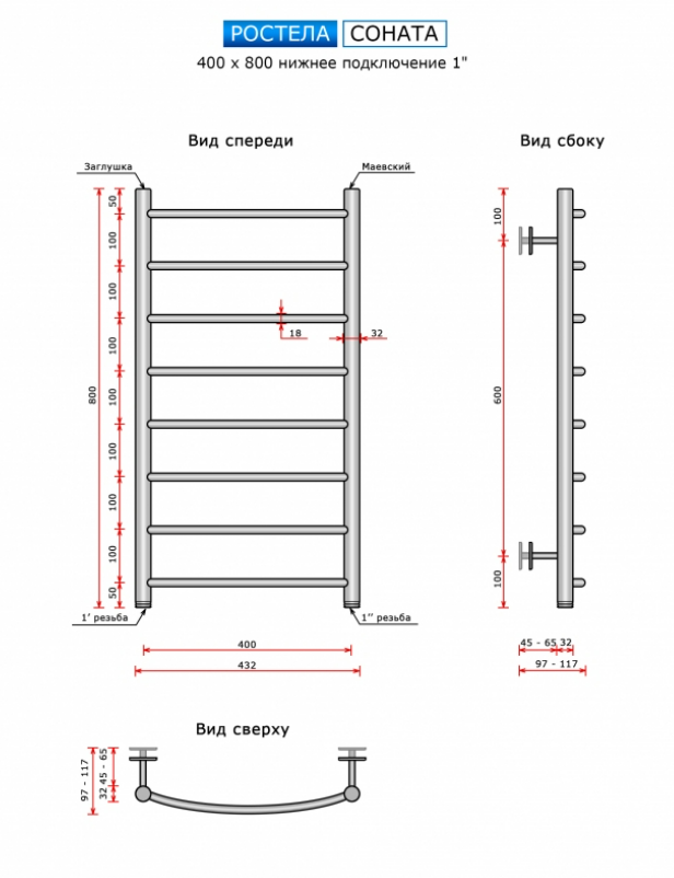 Полотенцесушитель Ростела Соната 400х800/8 (нижн.подв.,1")