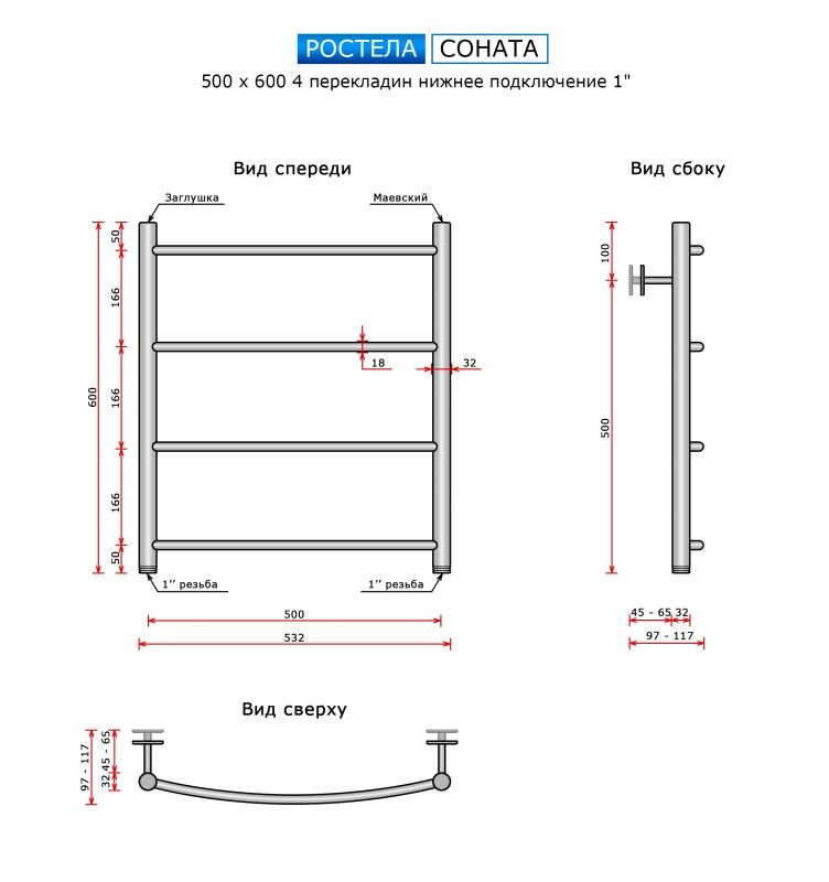 Полотенцесушитель Ростела Соната 500х600/4 (нижн.подв.,1")