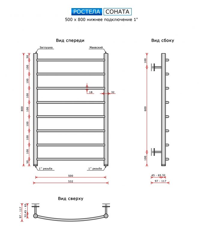 Полотенцесушитель Ростела Соната 500х800/8 (нижн.подв.,1")
