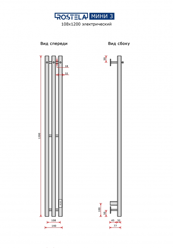 Полотенцесушитель Ростела Мини 3 108х1200/3 с крючками (диммер) хром