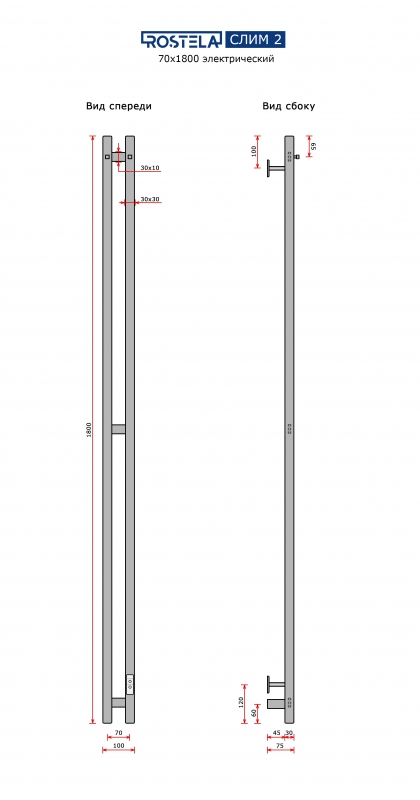 Полотенцесушитель Ростела Слим 2 70х1800/2 с крючками (диммер) хром