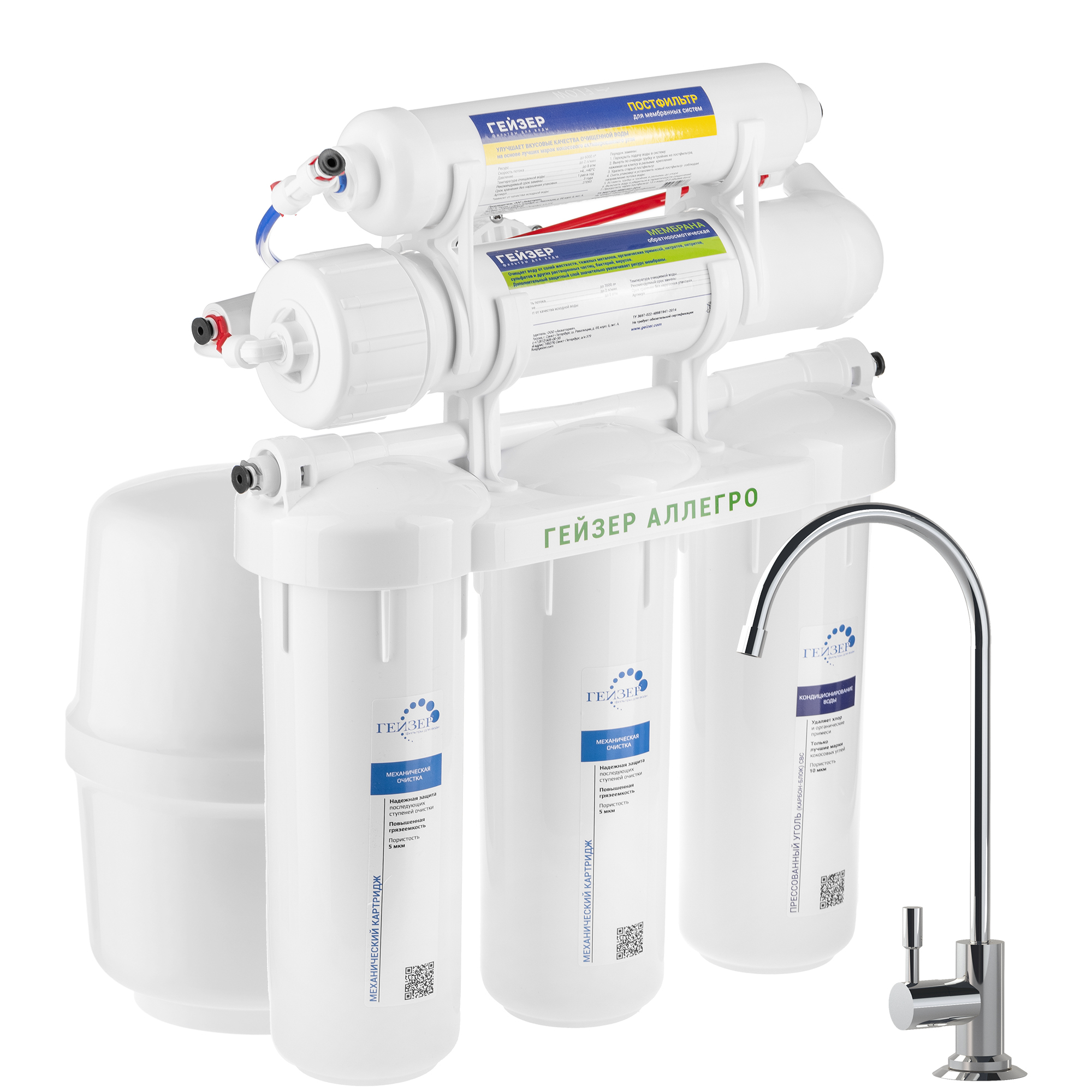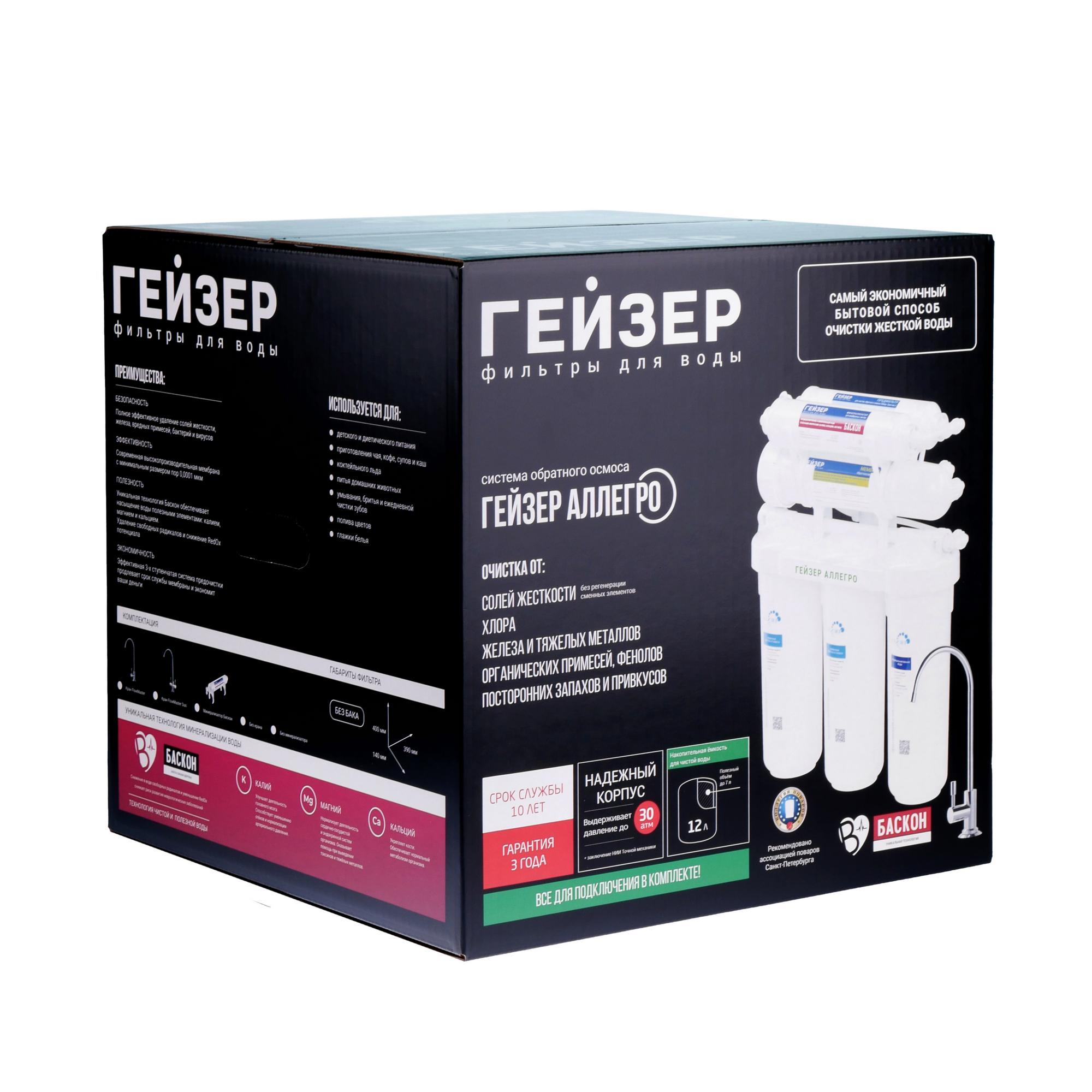 Фильтр Гейзер-Аллегро — это система очистки воды, работающая по принципу обратного осмоса. Она эффективно удаляет из воды соли жесткости, тяжелые металлы, механические примеси, хлор, органические соединения, фенолы, а также бактерии и вирусы. Вода после очистки становится прозрачной, без посторонних запахов и привкусов.