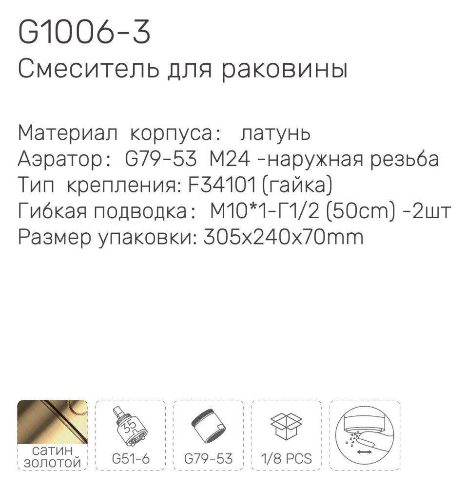 | Комплектация | Гибкая подводка (2 шланга для воды); Комплект крепления; Общая инструкция-вкладыш по сантехнике GAPPO; Ключи,накладки (если предусмотрено комплектом) |