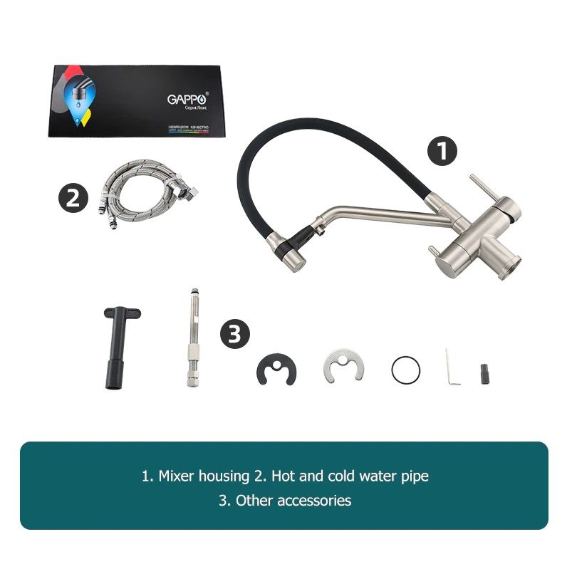 | Комплектация | Аэраторы, Штуцер, переходник для подключения к фильтру, Гибкая подводка (пара шлангов) для подключения G1/2, длина-400-500мм Общая инструкция-вкладыш по сантехнике GAPPO Ключи,накладки (если предусмотрено) |