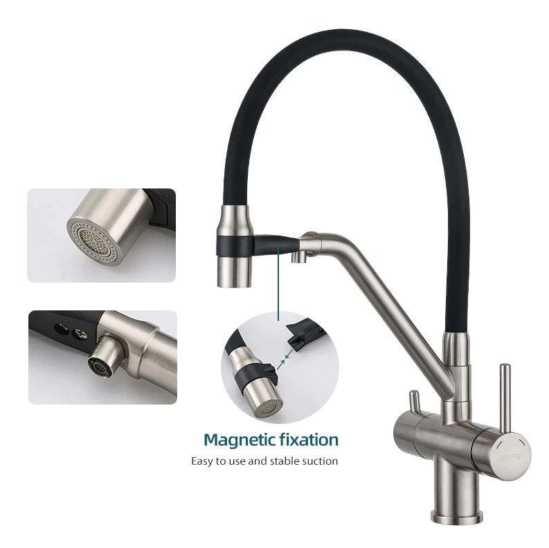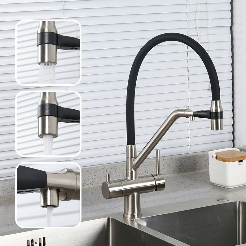 Смеситель для кухонной мойки с гибким силиконовым носом-изливом и функцией подключения фильтра воды.